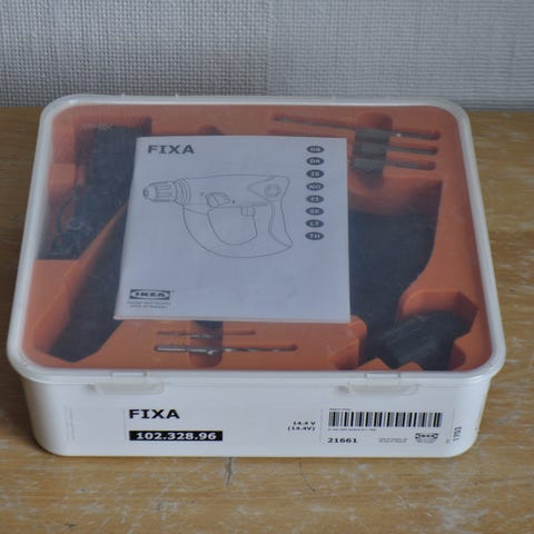 IKEA FIXA Værktøjssæt. Sættet indeholder hammer, skiftenøgle, tang, skruetrækker samt bitsholder med bits. Velegnet til mindre reparationer og gør-det-selv-opgaver i hjemmet. Obs. Den mangler 1 bits.