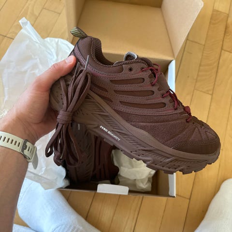 Hoka løbesko i størrelse 38. Skoen er designet til løb og har en kraftig mellemsål med farvegradient samt overdel i åndbart mesh i hvid og lyserød/abrikosnuance. Snørelukning for justerbar pasform. Velegnet til løbetræning og anden sport, hvor der ønskes en polstret og stabil løbesko.
