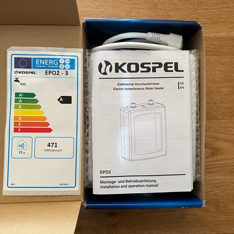 KOMPLET PAKKE: Ny Kospel KDE5 Gennemstrømningsvandvarmer + Tilbehør