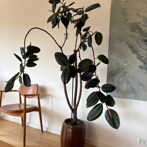 Gummitræ stueplante med grønne, ovale blade i lerpotte. Potte medfølger. Har haft den i 5-6 år, sælger fordi jeg flytter fra København. Afhentes på Nørrebro, København.