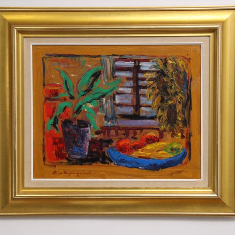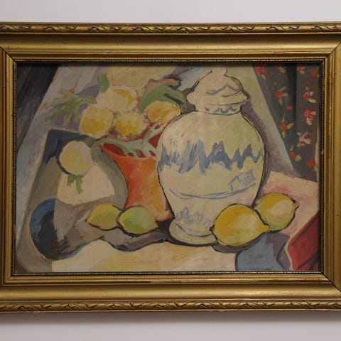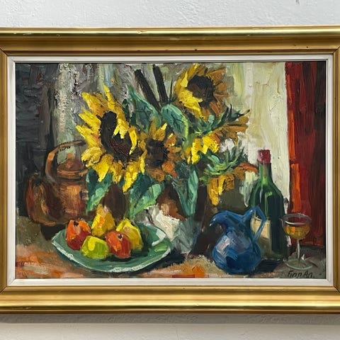 Motivet forestiller en blomsteropsats i mørk vase placeret foran en blå-hvid keramikkrukke samt frugt på bordet. Den løse og levende penselføring giver maleriet et moderne, næsten impressionistisk udtryk, samtidig med at motivet bevarer en klassisk stilleben-opbygning.
