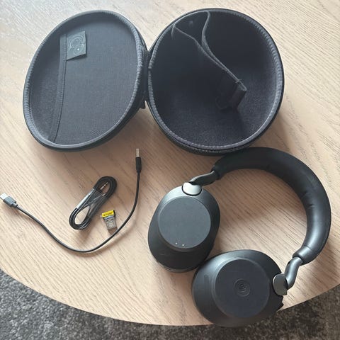Perfekt stand Jabra Evolve2 65, over-ear hovedtelefoner i sort. Trådløs model med polstret hovedbøjle og ørepuder. Indbygget mikrofon på bøjle til tale og opkald. Leveres med et etui, der beskytter hovedtelefonerne under opbevaring og transport. Velegnet til brug med computer, telefon og andre enheder med trådløs lydforbindelse.