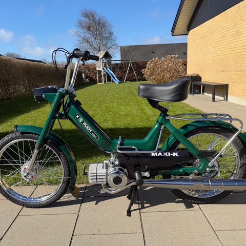 Puch knallert i sort. Klassisk model med sort sæde og kromdetaljer på fælge, styr og udstødning. Bagagebærer bagpå samt standard baglygte og reflekser. Egnet som mindre motoriseret køretøj til kortere ture og hverdagskørsel. Flere originale Puch-mærkater og emblem bagpå skærmen.