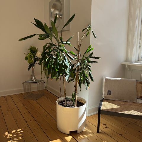 Stueplante i grønne nuancer i hvid potte. Planten har lange, smalle blade og er egnet som indendørs pynteplante. Leveres i rund potte, som kan placeres på bord, hylde eller gulv efter behov.