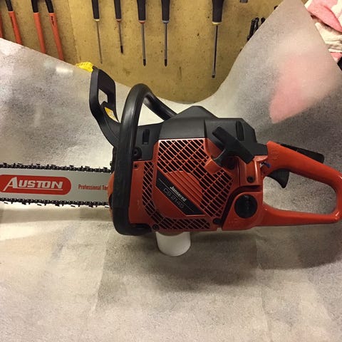 Jonsered 2141 Turbo motorsav i rød/sort. Benzindrevet kædesav med håndtag for og bag samt kæde- og sværdskærm. På billederne ses desuden ekstra sværd, kæder, filer, værktøj, brændstofdunke, høreværn/hjelm og sikkerhedsbukser, som eventuelt kan indgå som tilbehør, afhængigt af hvad sælger ønsker at medtage i handlen.