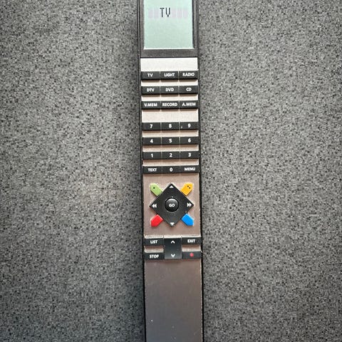 Bang & Olufsen Beo4 fjernbetjening. Klassisk B&O universalfjernbetjening med display øverst og numeriske taster. Fjernbetjeningen har dedikerede knapper til tv, radio, sat, dvd og andre funktioner samt navigationskryds med farvede funktionsknapper. Egnet til styring af kompatible Bang & Olufsen tv- og lydsystemer.