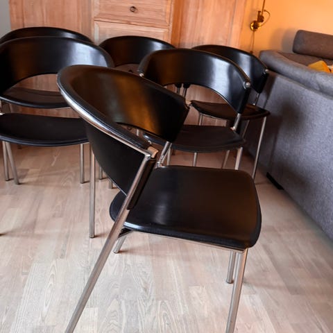 Brunt læder, super god stand, meget behagelige at sidde i. Sælges kun samlet. Nypris omkring 2000 kr/stk for mange år siden. Kan hentes Svinø Strand eller København