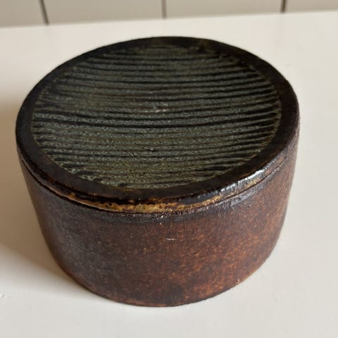 Stor krukke eller vase af Kirsten Sloth. Signeret. Fejlfri. Højde 16,5 cm. Diameter veksler fra 19,5 til 21,0 cm, da cirklen er lidt skæv - se foto. Afhentes Kbh. K eller Præstø. Sendes mod betaling.