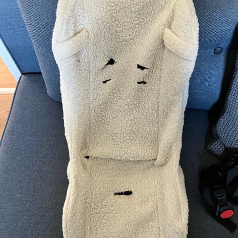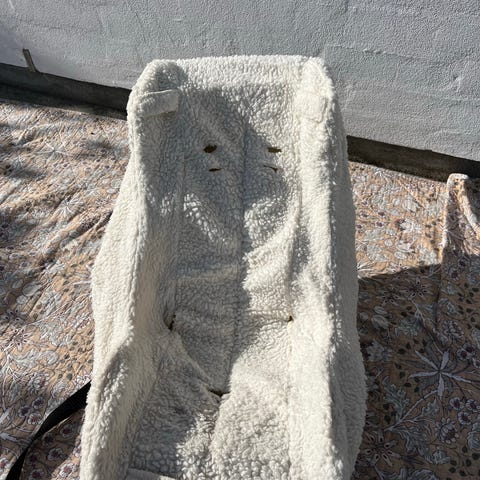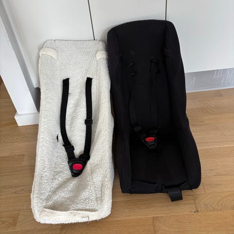 Melia babysæde/babyindsats med fempunktssele til ladcykel. Synlige brugsspor, men ellers i god stand. Har aldrig været involveret i uheld. Både betræk, seler og flamingo-basen er intakt.