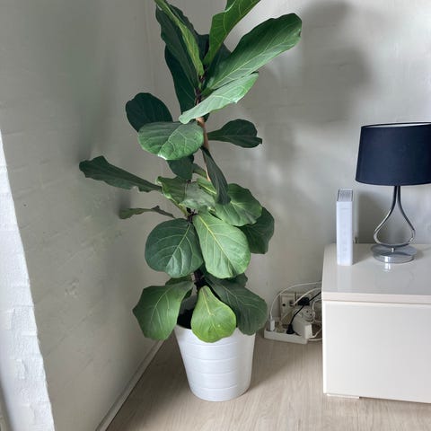 Ficus lyrata stueplante er ca 150 cm høj incl potte. Meget dekorativ og sælges kun fordi den er blevet for stor i min lille lejlighed. Planten står i en potte og egner sig som indendørs plante i stue eller i andre opholdsrum. Velegnet til placering ved et vindue med godt lys. Potten på billederne er inkluderet, og med jord omkring roden. Planten har en høj, slank stamme med bladfyldt top.