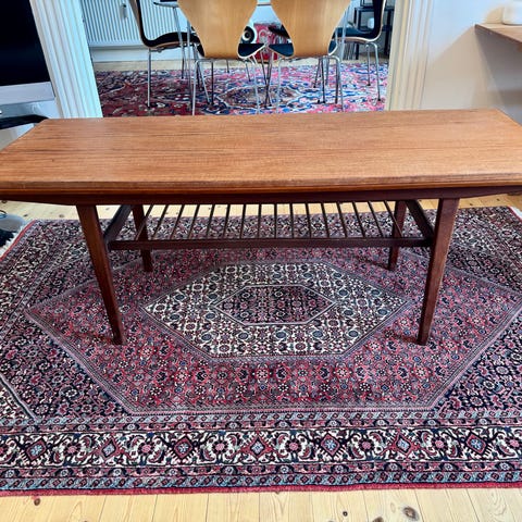 Ukendt designer men fremstår ganske pænt. Kan hæves og sænkes i flere højder, og kan også gøres bredere. Virkelig smart bord, fra 1950erne