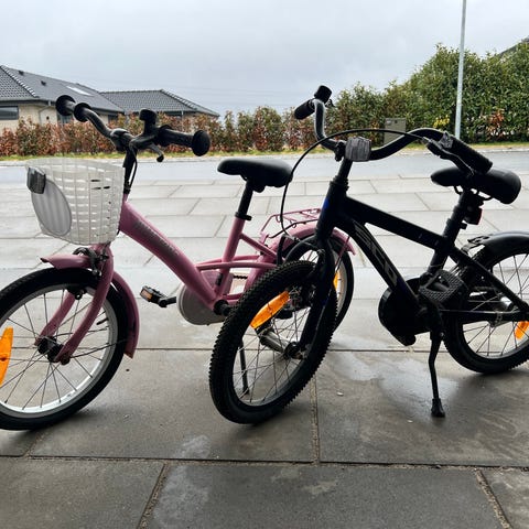 Blandet parti børnecykler i forskellige størrelser og farver. Der ses både mindre cykler med støttehjul og større børnecykler med bagagebærer og skærme. Cyklerne har kædeskærm, pedaler og sadel monteret. Egnede til børn i forskellige aldre afhængigt af højde og behov. Flere af cyklerne har kurv eller frontskjold samt reflekser. Sælges samlet eller enkeltvis efter aftale med sælger.
