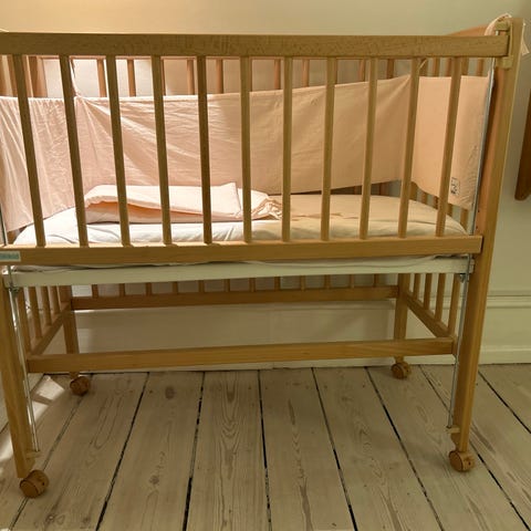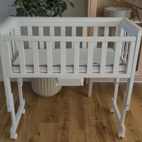 Fillikid bedside crib til baby. Sengen er i hvidmalet træ med tremmer hele vejen rundt og en side, der kan åbnes, så sengen kan stå tæt ved forældresengen. Velegnet som babys første seng ved siden af sengen i soveværelset.