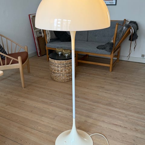 Louis Poulsen Panthella gulvlampe designet af Verner Panton. Klassisk standerlampe med halvkugleformet skærm og trompetformet fod i hvidt design. Lampen har indbygget ledning med fodkontakt til tænd/sluk. Velegnet som belysning i stue, læsehjørne eller andre opholdsrum, hvor der ønskes et diffust og behageligt lys.