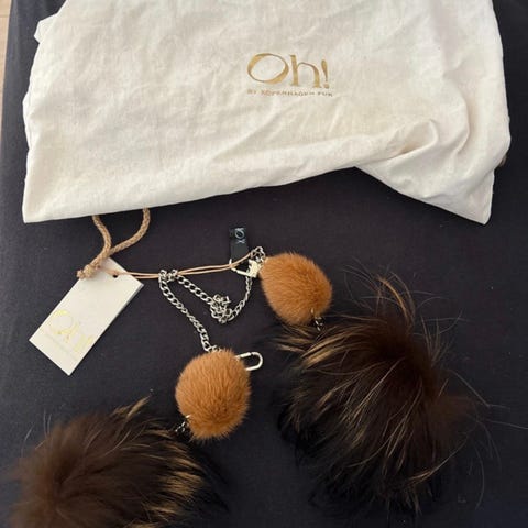 Pomponen er udført i ægte mink og i farven støvet rosa. Den er ca. 10 cm i diameter, har aldrig været brugt og fremstår derfor som helt ny.