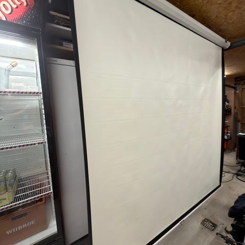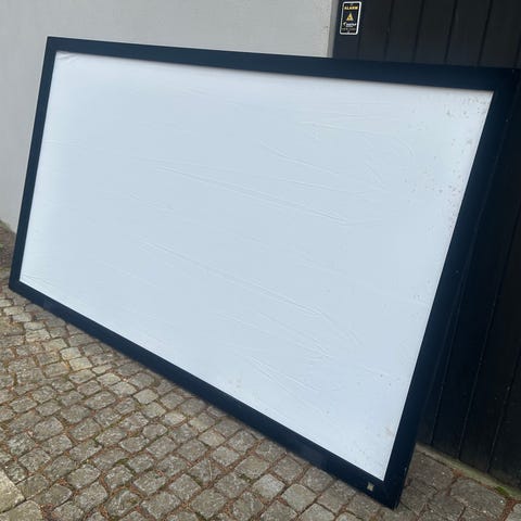Med sort kant ca 75 tommer, lærredet er i rigtig fin stand, kassetten har lidt brugsspor. Fungerer som et rullegardin med automatisk optræk.