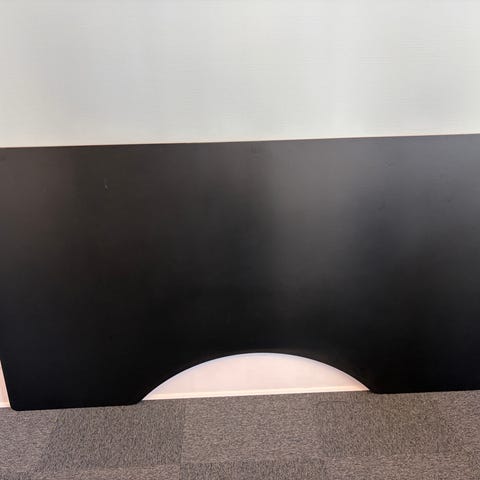 Skrivebord med hvid bordplade fra Randers og Radius, med sølvfarvede metalben. Bordet har let buede langsider og en rektangulær kabelgennemføring i midten af bordpladen, som gør det muligt at føre ledninger ned gennem bordet. Benene er rørformede med tværgående fødder, der giver stabilitet. Velegnet som arbejdsbord eller mødebord i kontor eller hjemmekontor. Kan hentes på Palægade København K.