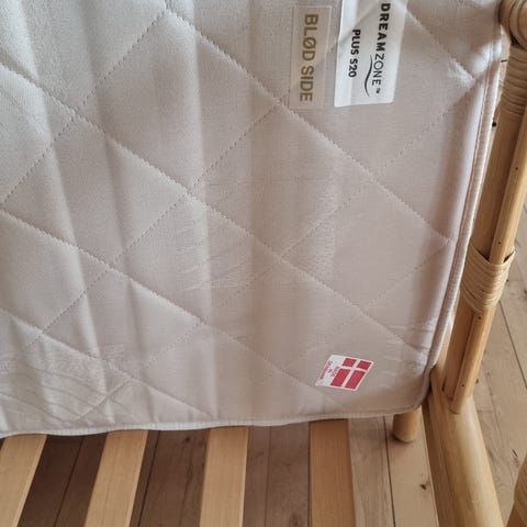 Dobbeltseng med smukt vintage sengestel i bambus og nyere madrasser (faste) samt topmadras. Vi elsker den, men har desværre ikke plads til den i vores nye hus.