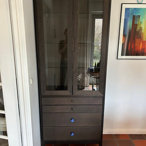 Udenpå i god stand. Sælges billigt pga. ridser på den ene side af midterste hylde indeni.
