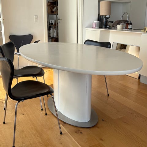 Skovby spisebord m/ 2 tillægsplader, laminat på fladen. Bordet er 140 cm, hver tillægsplade 45 cm, giver i fuld længde 230 cm . Stolene er med betrukket m/ sort uldstof. Bordbenene er afmonteret og lagt på stolene for at kunne ses og grundet pladsmangel.