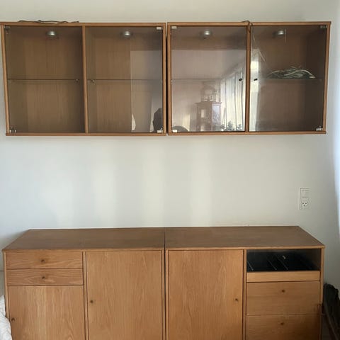 Meget fine reolsystemer. Man kan sætte dem på alle mulige måder. Fantasien har ingen grænser. Vi har været meget glade for vores men har ikke plads til det mere efter vi er flyttet. Der er skuffer med tryk system og skabe med hylder. Det minder meget om Mistral