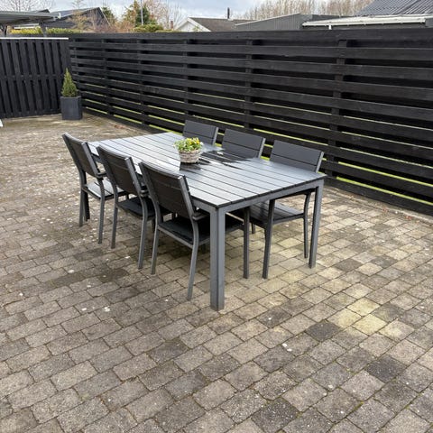 Havebord med 6 stole i hvidmalet træ. Sættet består af et rektangulært bord (90x160) med lamelbordplade og seks matchende stole med armlæn og krydsryg. Egnet til udendørs brug på terrasse, altan eller i have. Klassisk design med ensartet hvid finish på både bord og stole.