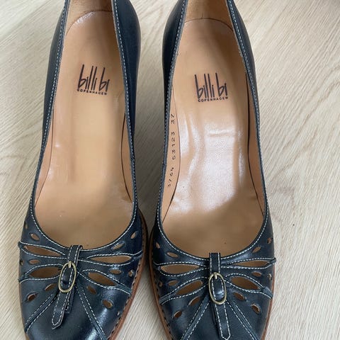 Flotte sorte stiletter fra Billi Bi i sort læder str. 39. Der er en lille fejl i læderet på den ene snude, der syner tydeligere på billedet end i virkeligheden (derfor den lave pris). Hæl ca. 7,5 cm og plateau foran ca. 1 cm. Brugt få gange.
