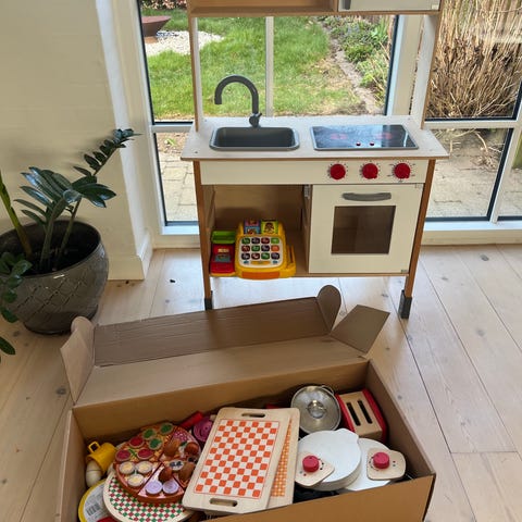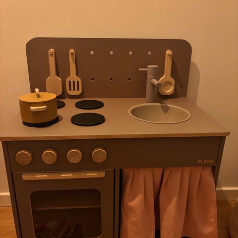 Flexa legekøkken i træ i rosa farve. Legekøkkenet har kogeplader, vask med armatur, ovn med låge og knapper på fronten. Under bordpladen er der opbevaringsplads skjult bag stofgardin. Velegnet til rolleleg i børneværelset eller legeområdet. Inkl. tilbehør som vist på billederne, herunder forskelligt legetøjsmad og service i træ og plast.