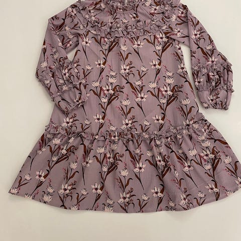 VRS kjole til pige i str. 122. Kjolen er i lyserød bomuld med blomsterprint og lange ærmer. Modellen har rund hals og volantkant forneden. Egnet som hverdags- eller festkjole til børn i den angivne størrelse.