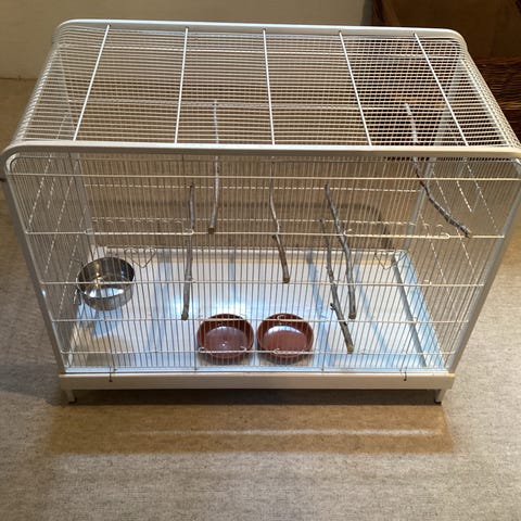 Fuglebur i hvidt metal med grøn plastbund. Buret har buet top, dør i front samt aftagelig bundbakke i plast. Indvendigt er der siddepinde, lille træstige og ophængt legetøj. Velegnet til mindre fuglearter afhængigt af målene, som kan oplyses ved opmåling.
