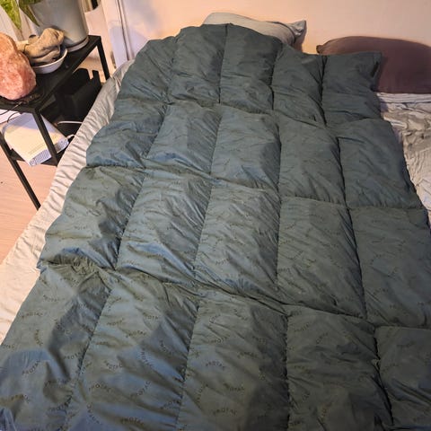 Dyne i grøn farve. Dynen har kvadratisk quiltet syning, som holder kuglerne jævnt fordelt. Virker beroligende ved uro og angst. Nypris 7000 kr