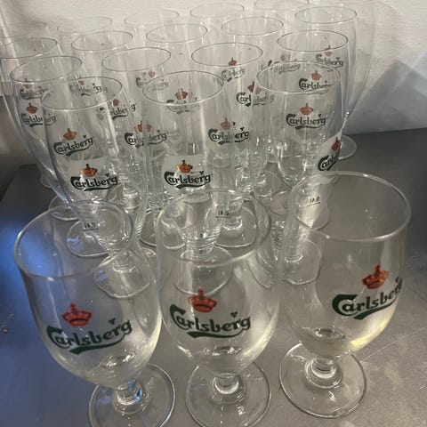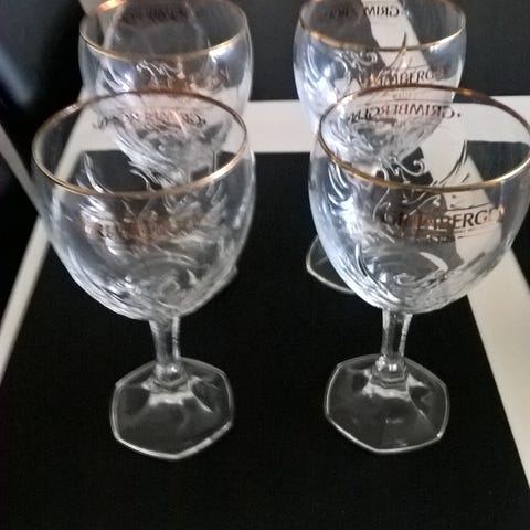 Grimbergen øl glas med guldkant og motiv. Sættet består af klare glas på fod med guldfarvet kant og dekorativt motiv på siden. Bemærk et af glassene har en falmet guldkant. Der er 8 af en salgs og 2 der er lidt højere