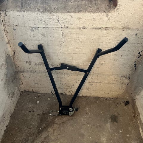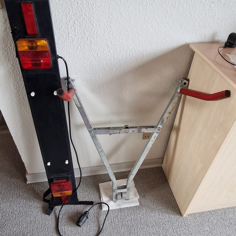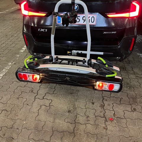 Cykelholder til anhængertræk med tilhørende lysbom. Holderen har gule håndtag og er sammenklappelig for lettere opbevaring. Lysbommen er udstyret med baglygter, blinklys og plads til nummerplade samt tilslutningsstik til bilens el-system. Velegnet til transport af cykler bag på bilen, hvor lovpligtige lys og nummerplade skal være synlige.