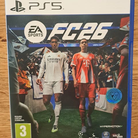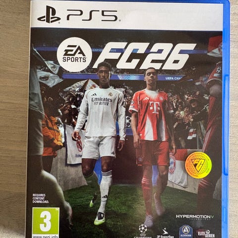 EA Sports FC 26 PlayStation 5 spil. Fysisk udgave på disk i standard PS5-plastcover. Fodboldspil med PEGI 3 aldersmærkning. Spillet leveres med originalt omslag og disk til brug på PlayStation 5-konsol.