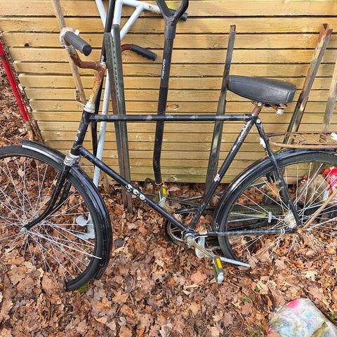 Velholdt Retro Mustang Herrecykel, som har tilhørt min morfar, der trænger til en kærlig hånd med skift af slanger, olie på kæden og luft i dækkene. Resterende fungerer super fint på den.