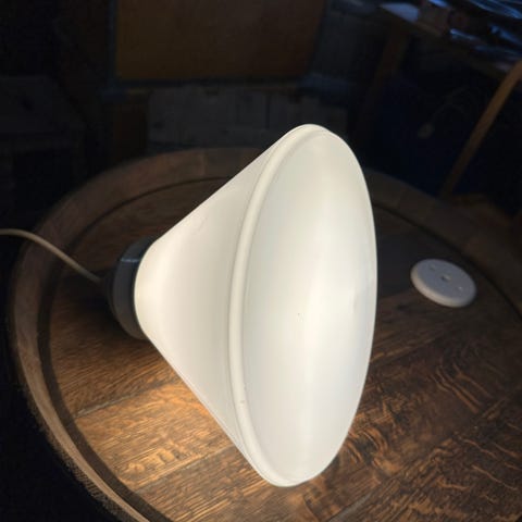 • Materiale: Skærm i opalt glas med top i blankt metal (børstet stål/krom look).