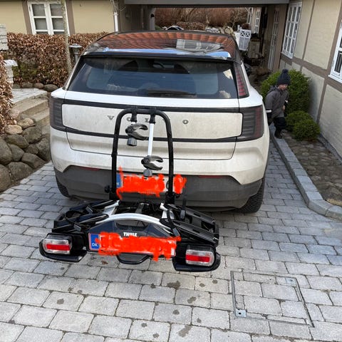 Thule VeloCompact 925 cykelholder til anhængertræk. Model til 2 cykler med en maksimal samlet lastekapacitet på 46 kg. Produktets egenvægt er 14,3 kg. Cykelholderen monteres på bilens anhængertræk og er egnet til transport af almindelige og elcykler. Med vippe funktion og lås på både træk og begge cykler. 2 nøgler medfølger. Nypris ca. 4400.-