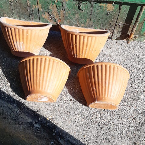 Samling af blomsterkrukker og urtepotter i forskellige størrelser. Krukkerne omfatter primært lerpotter samt en større sort plastkrukke. Flere af potterne er klassiske terracottafarvede, og der ses også en dekoreret potte i metal eller lignende materiale. Velegnet til indendørs eller udendørs brug til omplantning af blomster, krydderurter eller andre planter.