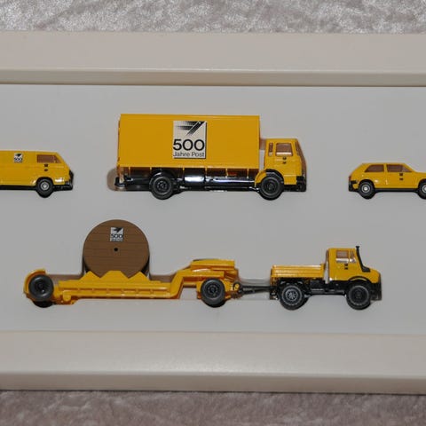 Sættet er brugt men bilerne fremstår som nye. Sættet består af en VW T1, en Opel Blitz lastbil, en Krupp Titan SW L-80 lastbil, og en Mercedes LPS 338 med anhænger. Leveres i original æske.