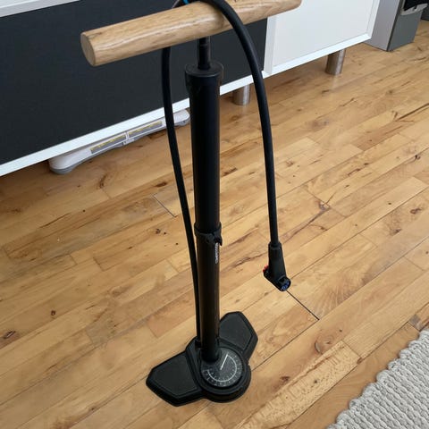Spectra cykelpumpe i sort. Gulvmodel med bred fodplade for stabilitet under pumpning. Velegnet til oppumpning af cykeldæk via slange med hoved monteret ved håndtaget. Passer til almindelig brug i hjemmet eller i cykelskuret til vedligeholdelse af cykler.