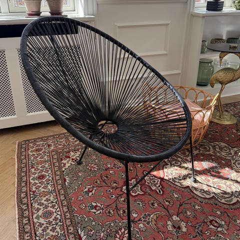 Udendørs stol i sort flet med karakteristisk ovalt sæde og åben trådkonstruktion. Stolen er velegnet til brug i have, på terrasse eller altan. Designet giver god ventilation og et let udtryk, og materialet er egnet til udendørs brug ved almindelig vedligeholdelse.