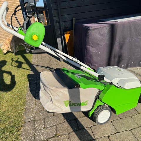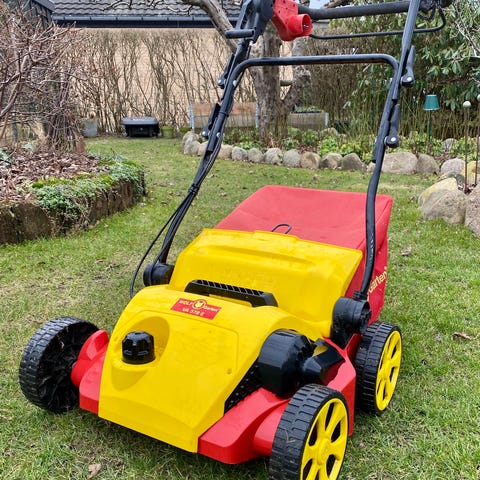 Wolf-Garten VA 303 E elektrisk vertikalskærer i rød/gul plastkonstruktion med hjul og håndtag. Maskinen er beregnet til at lufte og fjerne mos i græsplæner ved hjælp af roterende knive under bunden. Strømtilslutning sker via elkabel, som føres op langs håndtaget. Velegnet til almindelig havebrug, hvor der ønskes mekanisk bearbejdning af plænen for at forbedre vækstbetingelserne for græsset.