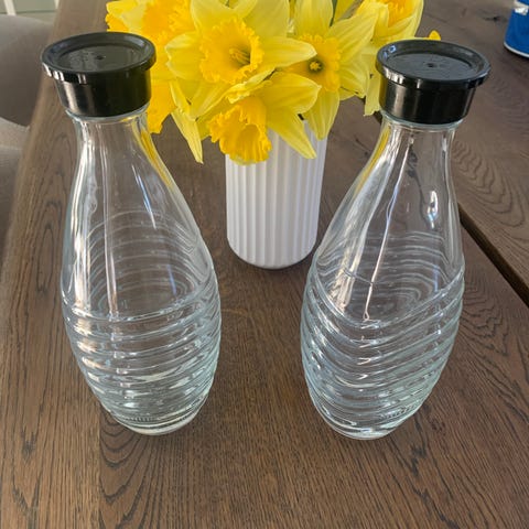 Sodastream glaskaraffel sæt i gennemsigtigt glas med sorte låg. Sættet består af to flasker, der er beregnet til brug med Sodastream DUO-maskine. Flaskerne er velegnede til servering og opbevaring af danskvand og andre kulsyreholdige drikke. Materialet er glas med plastlåg, og designet er slankt og cylindrisk, så flaskerne passer i de fleste køleskabsdøre.