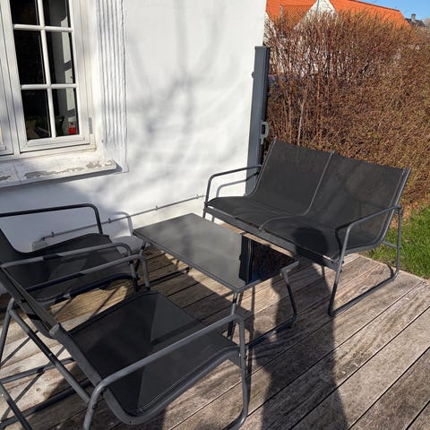 Der medfølger desuden to matchende solvogne/liggestole i grå med metalstel og tekstilnet i liggefladen. Solvognene har let buede armlæn og kan anvendes til afslapning og solbadning udendørs.