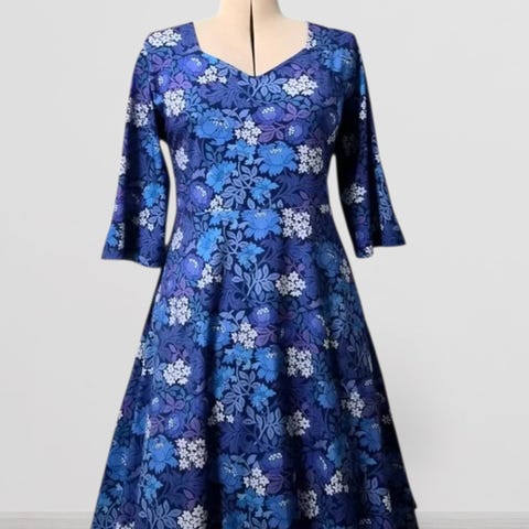 Ny A-snit retro kjole syet økotex bomuldsjersey med cool print af cirkler og prikker 🩷💛🤍 på sort bund.