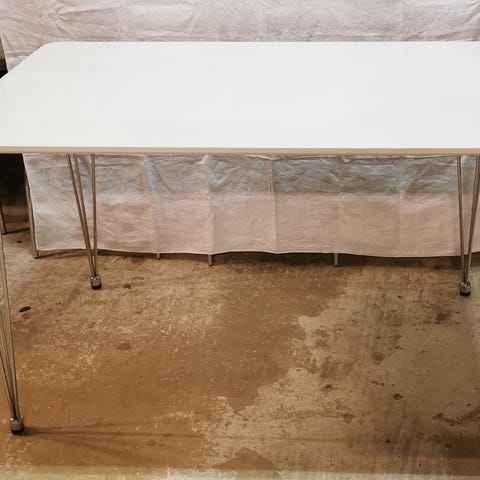 Hvidt bord med flisebordplade og underhylde. Bordet har rektangulær bordplade med lyse fliser og metalstel. Under bordpladen er der en åben hylde til opbevaring. Velegnet som arbejdsbord eller afsætningsbord i køkken, bryggers eller lignende rum.