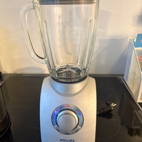 Philips blender med glasbeholder. Blenderen består af motorenhed med drejeknap til hastighedsindstilling, glas-kande med håndtag, låg med åbning samt aftagelig knivenhed. Enheden tilsluttes med almindelig netledning med stik. Egnet til tilberedning af smoothies, supper og andre blendede retter i køkkenet. Kan hentes i Kbh k