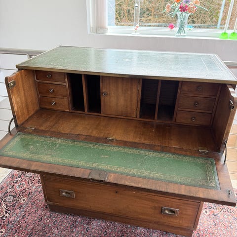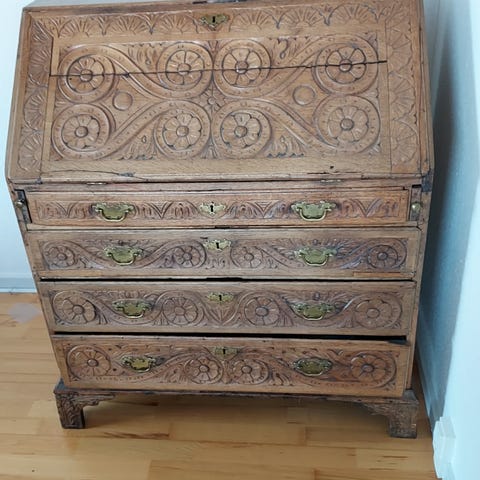 Skrivekommode i mørkt træ med klap og flere skuffer. Øverst er der en nedfældelig skriveklap, som åbner op til et indvendigt rum med små skuffer og rum til opbevaring af papirer og mindre genstande. Forneden er der fire store, udvendige skuffer med greb på fronten, der giver god plads til opbevaring af tøj, tekstiler eller kontorartikler. Møblet står på lave ben og har en klassisk, enkel udformning, der egner sig til brug som skriveplads og opbevaringsmøbel i stue, kontor eller soveværelse.