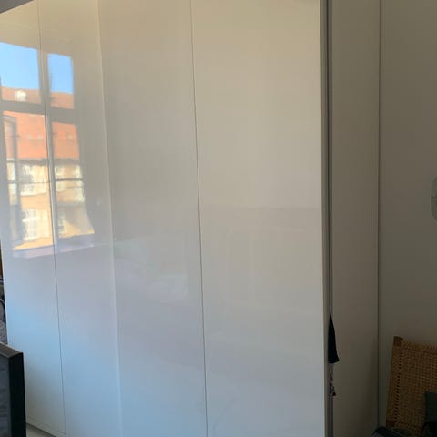 Garderobeskab/reol bestående af IKEA PAX skabe og malm kommode - DIY fronter med almuelister og messingegreb.
