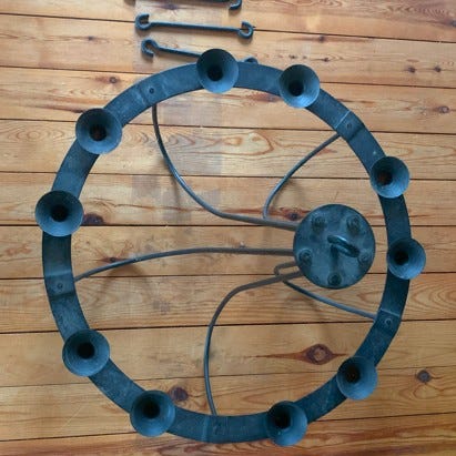 Smedejernslysekrone til 10 stk. lys, fyrfadslys eller olielamper. Diameter på lampen ca. 60 cm. Højde ca. 60 cm. Der medfølger 3 stk. kroge til at justere højden. Krogene er ca. 20 cm lange. Jeg har nogle olielamper + glasskåle til fyrfadslys der kan følge med.